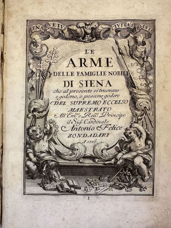 Rarissima edizione originale del 1716 di questa monografia sugli stemmi delle famiglie nobili senesi di autore anonimo. Il volume è formato da XVI tavole in calcografia che riportano gli stemmi delle famiglie nobili di Siena esistenti nel 1716. La prima tavola è esplicativa e mostra i simboli utilizzati nel volume. In buone condizioni. Copertina morbida decorata con rinforzo al dorso in buone condizioni con lievi usure ai margini e dorso. Legatura in buone condizioni. Pagine in buone condizioni con fioriture. In 8. cm. 24x17,5. Pp. XVI.Very scarce original edition of 1716 of this monography about the coat of arms of noble families from Siena by an anonymous author. The volume is made up of XVI calcographic plates showing the coat of arms of Siena nobels in 1716. The first plate illustrate the symbols used in the volume. In good conditions. Soft coeval decorated cover with reinforcement in the spine in good conditions lightly worn in the extremities. Binding in good conditions. Pages in good conditions with foxing. In 8. cm. 24x17,5. Pp. XVI.