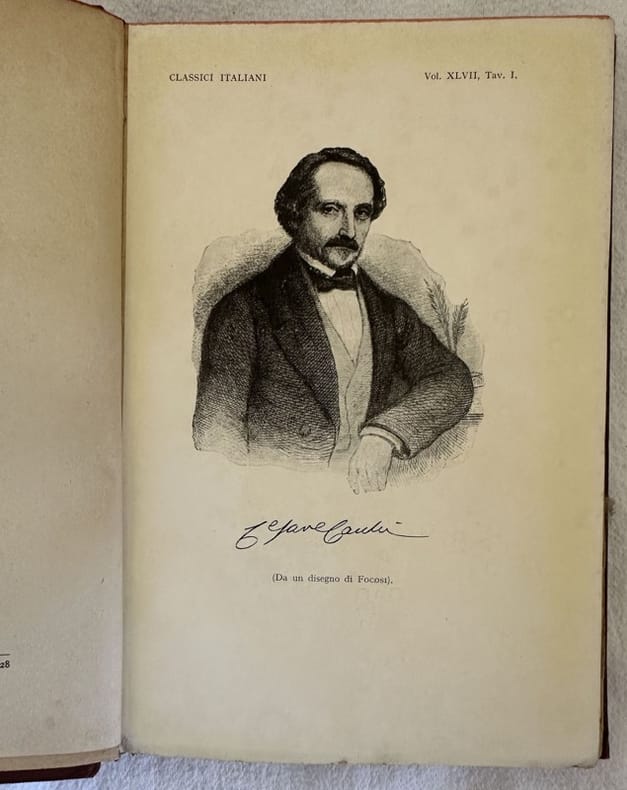 In 16. Dim. 18,5x12,5 cm. Pp. LIX+209+(3). Edizione del 1928 della serie "Collezione di classici italiani con note" di questa raccolta di novelle romantiche. Introduzione e note di Marcus de Rubrus. Sono presenti le novelle "Aloisio o la Lega Lombarda" di cesare Cantù, "La battaglia di Legnano" di Luigi Monteggia e "Ildegonda" di Tommaso Grossi. All'interno sono presenti due planches fotografiche. Bella brossura editoriale in tela decorata. In buone condizioni. Brossura editoriale in tela con decorazioni in oro ed a secco ai piatti in ottime condizioni generali con lievi usure ai margini e dorso. Legatura in buone condizioni. All'interno le pagine si presentano in ottime condizioni con rare fioriture. Edition of 1928 of the series "Collezione di classici italiani con note" of this collection of short novels of the romantic period. Introduction and notes by Marcus de Rubris There are the short novels "Aloisio o la Lega Lombarda" by Cesare Cantù, "La battaglia di Legnano" by Luigi Monteggia and "Ildegonda" by Tommaso Grossi. Inside there are two planches. Beautiful editorial decorated cover. In very good conditions. Cloth editorial cover with golden and embossed decorations in the plates in very good general conditions slightly worn in the edges and spine. Binding in good conditions. Inside pages are in very good conditions with occasional foxings.