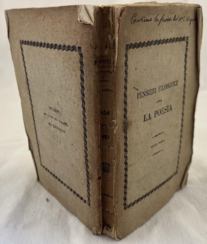 Edizione originale del 1824 di questa rara opera filosofica di autore anonimo sulla poesia. L'opera era composta da due parti, siamo in possesso solo della prima parte. All'interno: Vantaggi della poesia, Relazioni della poesia con la prosa oratoria e istoria, Proprietà principali, Relazioni della poesia colle nostre sensazioni, Cause dei piaceri prodotti dalla poesia, Cagioni che deviano le bellezze della poesia, Regole per dilettare colla poesia secondo le sue relazioni colle umane affezioni, Del buon gusto in poesia, Vantaggi principali che l'uomo può ritrarre dalla poesia ecc... Firma "J. M. Wagner" al frontespizio come sottolineato da un'antica nota manoscritta. In buone condizioni. Copertina editoriale in buone condizioni generali con lievi usure ai margini e dorso. Legatura in buone condizioni. Pagine in buone condizioni con rare fioriture. In 8. cm 19,5x13. Pp. 219+(3).Original edition of 1824 of this scarce phylosophical work of anonymous author about poetry <BR>The work was made up of two parts, we only have the first part. Inside: Relationship of poetry and history, Relation of poems with our sensations Causes of our pleasures produced by poetry, Rules of poetry with human feelings, Good tastes in poetry, ecc... Signature "J. M. Wagner" in the title page aas underlined by an antique handwritten note. In good conditions. Editorial cover in good conditions lightly worn in the extremities. Binding in good conditions. Pages in good conditions with occasional foxing. In 8. cm 19,5x13. Pp. 219+(3).<BR><BR>