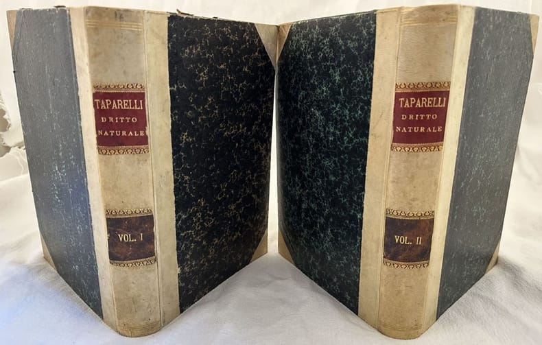 Edizione del 1883 di questa opera di diritto naturale scritta dal Padre gesuita, filosofo e sociologo Luigi Taparelli D'Azeglio (1793-1862) fratello del Senatore Massimo D'Azeglio. L'opera è composta da due volumi ed è completa. L'opera, pubblicata per la prima volta nel 1840-43 è una vera enciclopedia di morale, diritto e scienza politica ed è considerata la sua opera più importante. In buone condizioni. Copertina in mezza pergamena coeva con titolo e decorazioni in oro su tassello al dorso in buone condizioni generali con lievi usure ai margini e dorso. Legatura in buone condizioni. Pagine in buone condizioni con rare fioriture. In 8. cm 24,5x18. Pp. XII+514, 515. Edition of 183 of this work of natural right written by the jesuit phylosopher and sociologist Luigi Taparelli D'Azeglio (1793-1862) brother of Senatore Massimo D'Azeglio. The work is made up of two volumes and it is complete. The work, published for the first time in 1840-43 is a real aencyclopedia of morality, right and political science and is considered his most important work. In good conditions. Half leather coeval cover with spine title and decorations in good conditions lightly worn in the extremities. Binding in good conditions. Pages in good conditions with occasional foxing. In 8. cm 24,5x18. Pp. XII+514, 515<BR><BR>