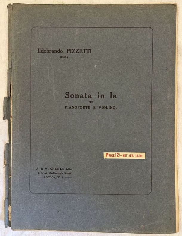 Edizione del 1920 di questo spartito per pianoforte e violino della melodia "Sonata in La" di Ildebrando Pizzetti (Parma 1880-Roma 1968). In buone condizioni. Copertina editoriale in buone condizioni con lievi usure marginali. Dorso quasi del tutto mancante. Legatura in buone condizioni ma corpo del libro staccato dalla copertina. Pagine in buone condizioni con rare fioriture. Ampia macchia di inchiostro da pag. 43 fino alla fine. In Folio. cm. 35x26. Pp. 54.Edition of 1920 of this score for piano and violin of the melody "Sonata in La" di Ildebrando Pizzetti (Parma 1880-Roma 1968). In good conditions. Editorial cover in good conditions lightly worn in the extremities. The spine is almost totally detached. Binding in good conditions but the body fot eh book detached from the cover. Pages in good conditions with occasional foxing.Wide ink stain from page 43 to the end. In Folio. cm. 35x26. Pp. 54.