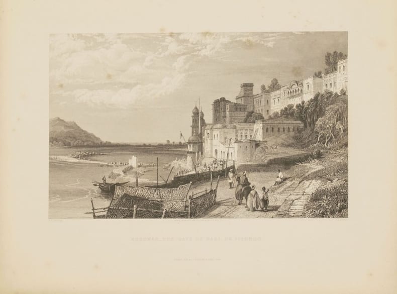 Veduta animata del 1845 circa della città di Haridwar in India. Autore: F. J. Havell su soggetto di J. D. Harding Data: 1845 circa Atlas: The indian Empire Tecnica: acquaforte Dimensione foglio: 21,5x27,5 cm Dimensione incisione: 12,5x20,5 Condizioni: Buone. Rare fioriture.Beautiful print of 1845 circa of the city of Haridwar in India. Author: F. J. Havell on drawing by J. D. Harding Atlas: The indian Empire Date: 1845 circaTechnique: steel etching engraving Leaf Dimension: 21,5x27,5 cm (8.1x10.8 inches) Engraving Dimension: 12,5x20,5 cm (4.9x7.5 inches) Conditions: Good conditions. Some foxings.