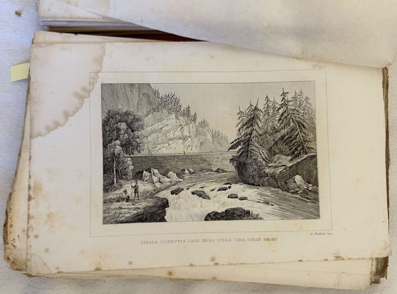 Prima edizione italiana del 1842 del resoconto di viaggio nel Peru e Messico di Antonio de Montesinos (1475-1540), Luis de Velasco (1534-1617) e Fernando de Alvarado Tezozomoc della collana "Raccolta di viaggi dalla scoperta del Nuovo Continente fino a di nostri". L'opera è in un volume ed è completa. All'interno sono presenti 14 incisioni tra cui alcune vedute: Tempio del sole presso Cuzco in Perù, Ritratto di D. Sebastiano di Belalcazar conquistatore di Quito, Esercizi ginnastici dei Selvaggi, Strada costruita dagli Incas sulla cima delle Andes, Ritratti di altri conquistatori, Casa del Velasco presso Quito, Pianure dell'Orellana, Città del Messico ecc... In buone condizioni, non è mai stato rilegato. Copertina morbida posticcia in buone condizioni generali con lievi usure ai margini e dorso. Legatura assente. Pagine in buone condizioni con rare fioriture. In 8. cm 26x17. Pp. 586+(2).First italian edition of 1842 of the resuming of travel in Peru and Mexico by Antonio de Montesinos (1475-1540), Luis de Velasco (1534-1617) and Fernando de Alvarado Tezozomoc of the series "Raccolta di viaggi dalla scoperta del Nuovo Continente fino a di nostri". The work is in one volume and it is complete. Inside there are 14 engravings with some views: Tempio del sole presso Cuzco in Perù, Ritratto di D. Sebastiano di Belalcazar conquistatore di Quito, Esercizi ginnastici dei Selvaggi, Strada costruita dagli Incas sulla cima delle Andes, Ritratti di altri conquistatori, Casa del Velasco presso Quito, Pianure dell'Orellana, Città del Messico ecc... In good conditions, still unbound. In fair conditions Soft false cover in good conditions lightly worn in the extremities. Binding is missing. Pages in good conditions with occasional foxing. In 8. cm 26x17. Pp. 586+(2).<BR><BR>