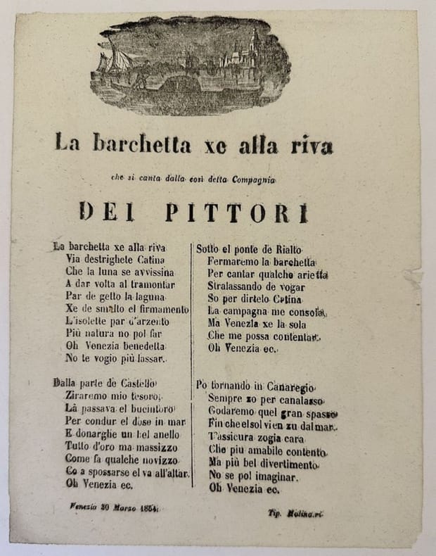Rarissimo poema del 1854 in dialetto veneziano. Piccola veduta della laguna e una gondola. Il foglio è stato incollato su un foglio telato. In ottime condizioni. Dim. foglio cm 22,5x17,5 Dim. foglio telato cm 36x31Very scarce powem of 1854 in venetian dialect. Little view of the lagoon and a gondola. The page has been attached to a clothed page. In ottime condizioni. Dim. foglio cm 22,5x17,5 Dim. foglio telato cm 36x31