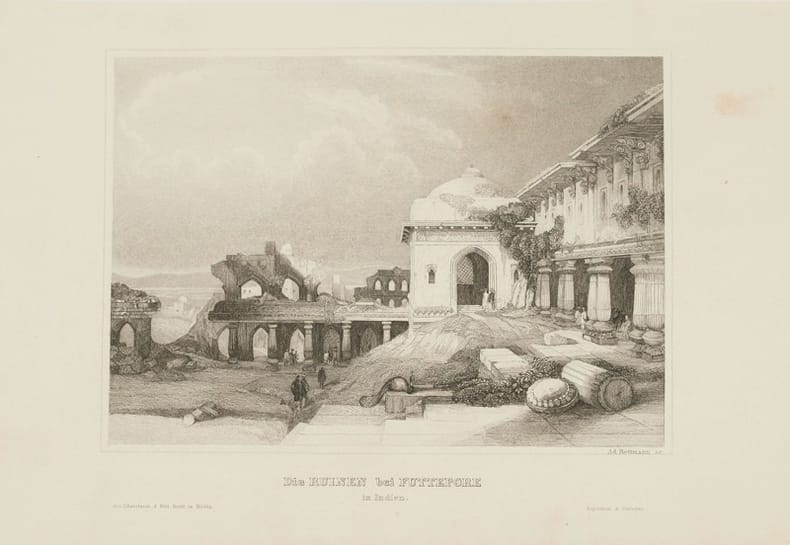 Bella veduta del 1860 circa delle rovine di Futtepore in India. Autore: Hildburghausen Institute Data: 1860 circa Atlante: Meyer s Universum 1838-1860 circa Tecnica: acquaforte Dimensione foglio: 16x23 cm Dimensione incisione: 10,5x16 cm Condizioni: Buone. Rare fioriture.Beautiful print of 1860 circa of the ruins of Futtepore in India. Author: Hildburghausen Institute Atlas: Meyer s Universum 1838-1860 circa Date: 1860 circa Technique: steel etching engraving Leaf Dimension: 16x23 cm (6.1x9.1 inches) Engraving Dimension: 10,5x16 cm (4.5x6.3 inches) Conditions: Good conditions. Some foxings.<BR><BR>