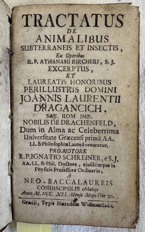 Raro trattato del 1741 compilato sulle opere di Athanasius Kircher sugli animali sotterranei e gli insetti a cura di Ignatio Schreiner. Tre capitoli sono dedicati ai draghi alati con descrizione delle varie specie. Un capitolo agli uomini sotterranei e le loro case; ai demoni sotterranei, insetti, lombrichi. Seguono esperimenti su diversi tipi di insetti tra le quali le farfalle, mosche, scarabei, scorpioni, rane e serpenti, esperimenti in Puglia e Sicilia, Sterminio delle locuste ecc... Antica nota manoscritta al contropiatto anteriore. Pagina 23 e 47 mancanti. In buone condizioni. Copertina in piena pelle con decorazioni a secco al dorso e piatti in buone condizioni generali con lievi usure marginali. Legatura in buone condizioni. Pagine in buone condizioni con fioriture. Pagina 23 e 47 mancanti. In 24. Dim. 13,5x8 cm. Pp. (6)+156+(6).Scraace treaty of 1741 written on the works of Athanasius Kircher about subterreneans animals and insects by Ignatio Schreiner. Three chapters are dedicated to winged dragons with description of different species. A chapter of subterrenean men and their houses; to subterrenean demons; insects,worms. Then experiments on different kind of insects as butterflies, flies, snakes and frogs, experiments in Puglia and Sicily, Sterminio delle locuste ecc... Antique handwritten notes in the front counterplate. Pages 23 and 47 lack. In good conditions. Full leather with embossed title and decorations in the spine and plates in good general conditions lightly worn in the extremities. Binding in good conditions. Inside pages are in good conditions with foxing. Page 23 and 47lack. In 24. Dim. 13,5x8 cm. Pp. (6)+156+(6).
