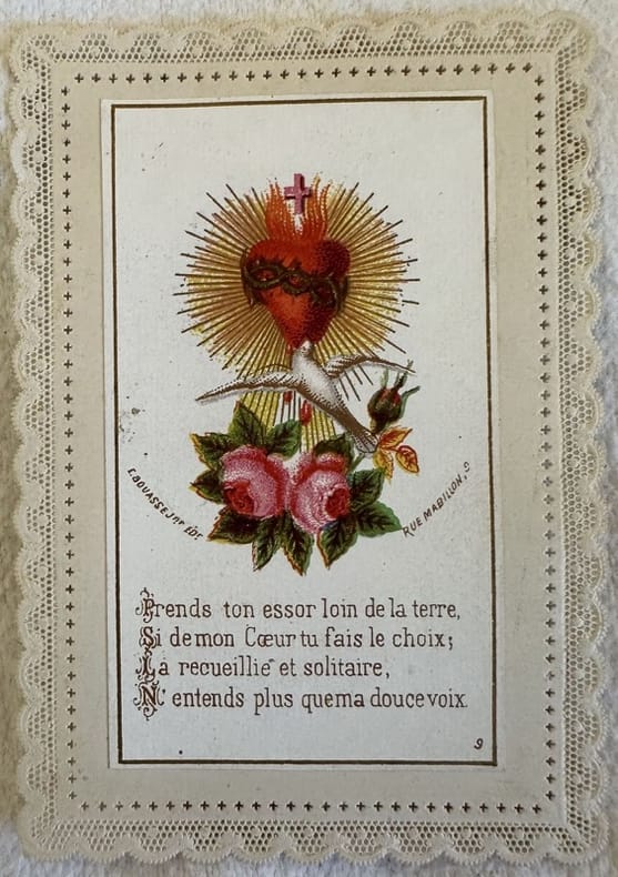 Immaginetta sacra del 1856 del Sacro Cuore di Gesù con margini ricamati.<BR>Al verso orazione e preghiera.<BR>In ottime condizioni. Dim. cm 9,5x6,5. Holy image of 1856 of the Holy Heart of Jesus with embroidered edges. In the verso oration and prayer. In very good conditions. In 24. Dim. cm 9,5x6,5.