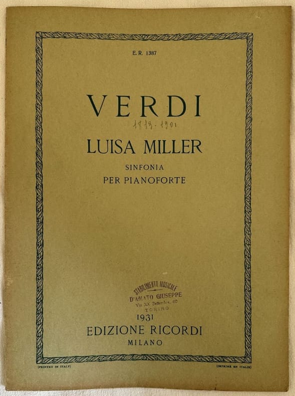 Edizione Ricordi del Agosto 1931 della melodia "Luisa Miller" del compositore Giuseppe Verdi (1813-1901). In ottime condizioni. Copertina editoriale in ottime condizioni con lievi usure marginali. Legatura in buone condizioni. Pagine in ottime condizioni con rare fioriture.In folio. cm. 32x23,5. Pp. 10.Ricordi eition of august 1931 of the melody "Luisa Miller" by the composer Giuseppe Verdi (1813-1901). In very good conditions Editorial cover in very good conditions lightly worn in the extremities. Binding in good conditions. Pages in very good conditions with occasional foxing. In folio. cm. 32x23,5. Pp. 10.