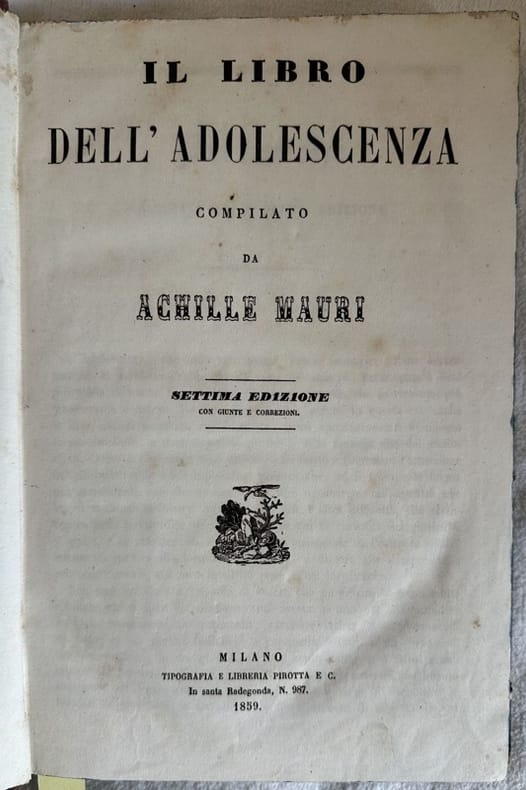 Edizione del 1859 di questa crestomazia di storico-letteraria di autori vari a scopo pedagogico per il periodo adolescenziale. La prima edizione dell'opera venne criticata e censurata in alcune parti, ritenute non adatte a dei ragazzi. Tagli marmorizzati In buone condizioni. Copertina in mezza tela in ottime condizioni generali con usure ai piatti e margini. Legatura in buone condizioni. All'interno le pagine si presentano in ottime condizioni con rare fioriture. In 8. cm 25,5x17,5. Pp. 414.