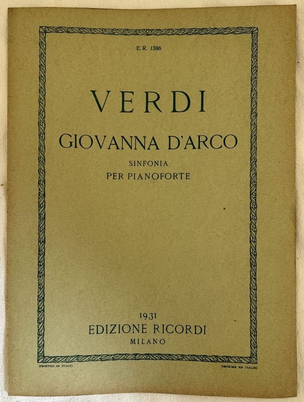 Edizione Ricordi del Giugno 1931 della melodia "Giovanna D'Arco " del compositore Giuseppe Verdi (1813-1901). In ottime condizioni. Copertina editoriale in ottime condizioni con lievi usure marginali. Legatura in buone condizioni. Pagine in ottime condizioni con rare fioriture.In folio. cm. 31,5x23,5. Pp. 12.Ricordi eition of june 1931 of the melody "Giovanna D'Arco" by the composer Giuseppe Verdi (1813-1901). In very good conditions Editorial cover in very good conditions lightly worn in the extremities. Binding in good conditions. Pages in very good conditions with occasional foxing. In folio. cm. 31,5x23,5. Pp. 12.<BR><BR>
