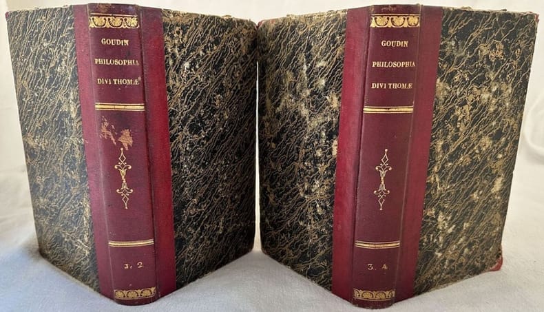 Edizione del 1851 di questa opera di filosofia del filosofo e teologo Antoine Goudin (1639-1695) seguace della dottrina scolastica. Quest'opera Ë composta da quattro tomi ed è completa. All'interno: Dottrina di San Tommaso, Ordini dei religiosi e primato dei teologi, Natura della filosofia, Proprietà dei termini, Supposizione, Universalità dei termini, Definizione dei nomi, Sull'astrazione, Divisone delle proposizioni, Opposizione, Equipollenza, Sillogismi, logica, Azione e passione, postpredicamenti, Proposizione mentale, Felicità, Origine del libero arbitrio, Atti volontari, passioni, Virtù, Ente, Ente spirituale, Esistenza di Dio, Angeli, Premonizioni ecc.. Il secondo e terzo dedicate alla fisica: Cartesio, materia e forma, natura e cause, arte e artifici, fato, moto, infinito, tempo, luogo, cielo e mondo, mondo celeste, stelle e pianeti, moto celeste, corpi celesti, Copernico, elementi, meteore, anima, piante (anatomia, divisione, propagazione, utilità e uso), Animali (volatili, animali terrestri, anima ecc..) ecc... In buone condizioni e completa. Copertina in mezza pelle con titolo e decorazioni in oro al dorso in buone condizioni generali con lievi usure ai margini e dorso. Legatura in buone condizioni. All'interno le pagine si presentano in buone condizioni con fioriture. In 8. cm 18,5x11,5. Pp. XI+271+(5)+240, 237+(3)+311.