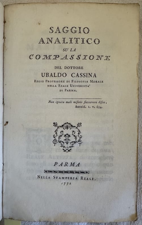 Edizione del 1772 di questa rara opera filosofica scritta da Ubaldo Cassina professore di filosofia all'Università di Parma. Questo è il suo saggio più celebre ispirato dall'Emile di Rousseau e dal'Essai analytique sur les facultes de l'ame del Bonnet e nel quale propone una teoria meccanica del sentimento della compassione (Cfr. Treccani online). In buone condizioni. Copertina morbida coeva in buone condizioni generali con lievi usure ai margini e dorso. Legatura in buone condizioni. Pagine in buone condizioni con rare fioriture. In 16. cm 18,5x12. Pp. (8)+111+(1).Edition of 1772 of this scarce phylosohpical work written by Ubaldo Cassina teacher of phylosophy in the University of Parma. This is his most famous essay inspired from the Emile of Rousseau and fromEssai analytique sur les facultes de l'ame del Bonnet in whcih he proposes a mechanical theory of feeling of compassion (Cfr. Treccani online). In good conditions. Soft coeval cover in good conditions lightly worn in the extremities. Binding in good conditions. Pages in good conditions with occasional foxing. In 16. cm 18,5x12. Pp. (8)+111+(1).
