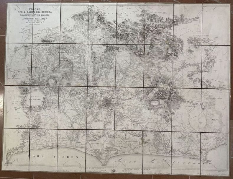 Mappa telata della Campagna Romana del 1862 di Luigi Piale. La mappa è molto particolareggiata e indica le varie frazioni, zone montuose e strade. Alcune annotazioni a penna. In ottime condizioni Dim. cm 95,5x73 Dim. chiusa cm 18,5x12. Clothed map of Rome Countryard of 1862 by Luigi Piale. The map is rich of detailes of the different little towns, mountains and streets. Some handwritten notes. In very good conditions. Dim. cm 95,5x73 Dim. chiusa cm 18,5x12