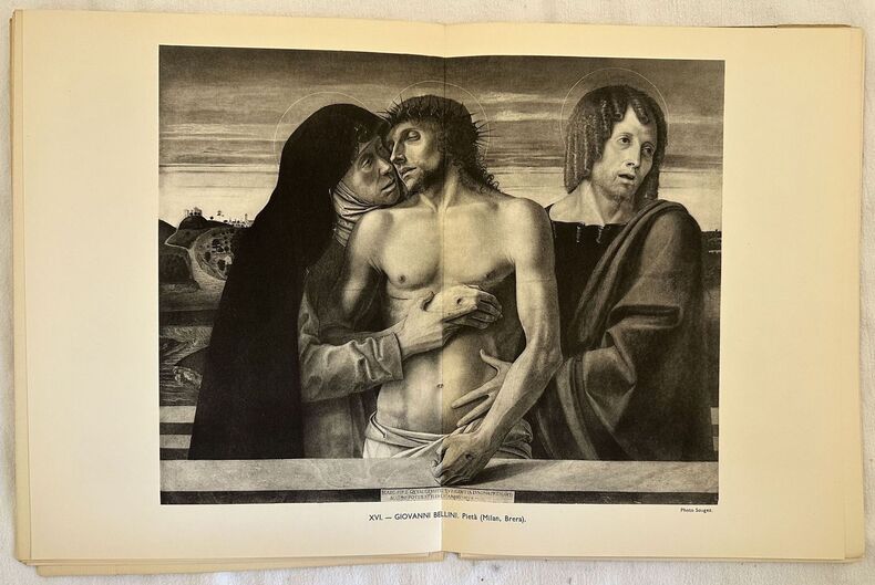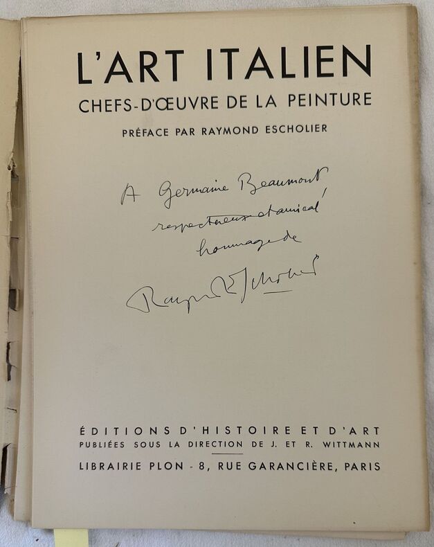 Edizione del 1935 di questo volume fotografico sui capolavori dela pittura italiana a cura di Raymond Escholier. Dedica dell'autore al frontespizio alla giornalista Germaine Beaumont (1890-1983). In discrete condizioni. Copertina editoriale in mediocri condizioni generali con usure e mancanze ai margini e dorso. Piatti staccati. Legatura assente. Pagine in buone condizioni. In 4. cm 29,5x22,5. Pp. (25).Edition of 1935 of this photographic volume about the masterpieces of italian art written by Raymond Escholier. Dedication fot he author in the title page to the journalist Germaine Beaumont (1890-1983). In fair conditions. Editorial cover in poor conditions lightly worn with lackings in the extremities. Plates are detached. Binding is missing. Pages in good conditions. In 4. cm 29,5x22,5. Pp. (25).