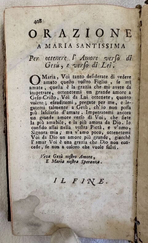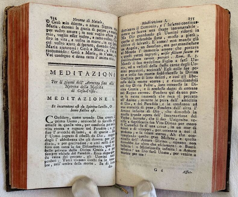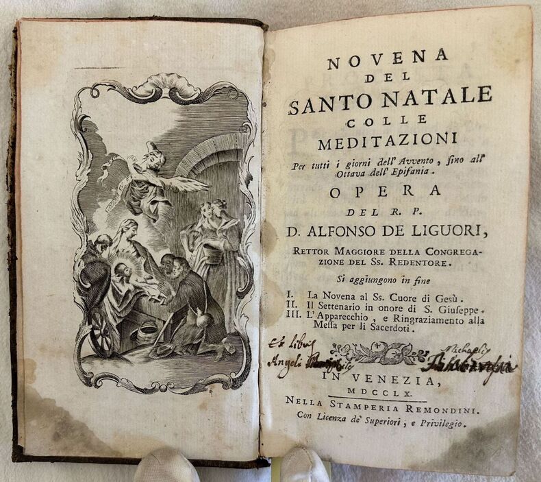 Edizione Remondini del 1760 di questa celebre opera di Alfonso de Liguori (1696-1787) sulla novena e meditazioni per il Natale. De Liguori ha avuto un ruolo chiave nel dibattito del periodo tra il Giansenismo ed il significato preciso della legge, dimostrandosi come il pi? famoso ed influente.I suoi manuali sono quelli che hanno saputo dare più risposte ai dubbi che pervadevano la cristianità, e sono stati delle pietre miliari per i successivi del XIX secolo. All'interno: novena al Ss. Cuore di Gesu, Settenario in onore di San Giuseppe, Apparecchio e ringraziamento alla Messa per i Sacerdoti. Bella incisione in antiporta della natività e una tavola fuori testo. Firma al frontespizio. In buone condizioni e completo Copertina in piena pelle coeva con titolo e decorazioni in oro al dorso in buone condizioni generali con lievi usure ai margini e dorso. Piccoli segni di tarlo in copertina. Legatura in buone condizioni. All'interno le pagine si presentano in buone condizioni con rare fioriture. In 16. cm 17x10. Pp 408.Remondini edition of 1760 of this famous work by Alfonso de Liguori (1696-1787) about novena and meditations for Christmas. Inside: novena to Ss. Cuore di Gesu, Settenario in onore di San Giuseppe, Apparecchio e ringraziamento alla Messa per i Sacerdoti. Beautiful engraving in the frontspice about nativity and an out of text plate. Signature in the title page. In good conditions and complete. Leather coeval cover with gilted title and decorations in the spine in good conditions lightly worn in the extremities. Binding in good condition. Pages in good conditions with occasional foxing. In 16. cm 17x10. Pp 408.<BR><BR>