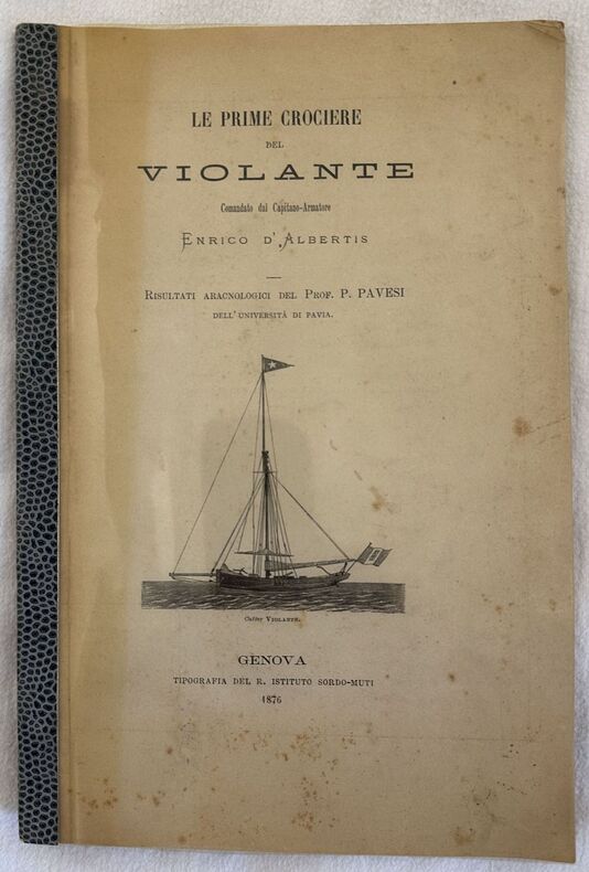 Rara monografia di aracnologia a cura del Prof. Pavesi dell'Università di Pavia. Partito a bordo del vascello "violante" comandato da Enrico D'Albertis di Genova venne varato nel 1875 e costruito appositamente con lo scopo di arricchire di nuove collezioni il Museo Civico di Genova. Nella prima parte descrizione della navigazione. Segue descrizione delle specie di aracnidi ritrovati e un elenco parziale delle zone di rritrovamento (Gorgona, Capraia, Isola dei topi, Isola d'Elba, Isola Pianosa, Montecristo, Giglio, Giannutri, Caprera, Serpentara, Vacca, Pantelleria, Galita). In buone condizioni. Copertina protettiva moderna in ottime condizioni generali. Legatura in ottime condizioni. Pagine in buone condizioni con fioriture.Qualche strappo orizzontale riparato nelle pagine dalla 41 alla fine senza perdita di testo. In 8. Dim. 24x16 cm. Pp. 47. Scarce monography of aracnology by Prof. Pavesi of the university of Pavia. He travelled on bortad of "violante" vessel headed by Enrico D'Albertis from Genova. The vessel was built in 1875 and projected with the aim to enrich the Museum of Genoa of new collections. In the first part description of travel. Then description of the spiders found and a partial list of the areas of founding (Gorgona, Capraia, Isola dei topi, Isola d'Elba, Isola Pianosa, Montecristo, Giglio, Giannutri, Caprera, Serpentara, Vacca, Pantelleria, Galita). In good conditions. Modern protective carton in very good general conditions. Binding in very good conditions. Inside pages are in good conditions with foxings. Some horizontal tear repaired in pages from 41 to the end with no loss of text. In 8. Dim. 24x16 cm. Pp. 47.