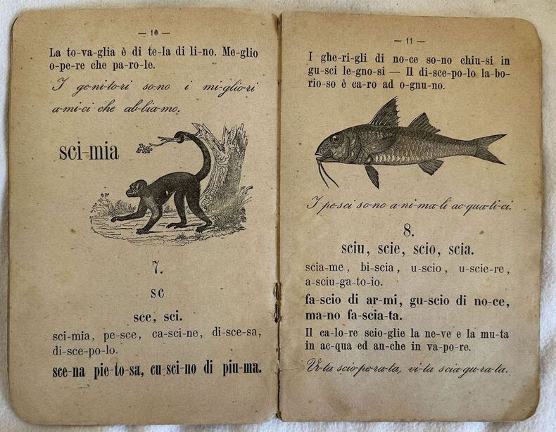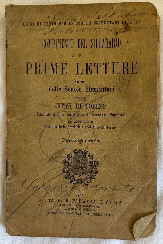 Edizione del 1893 di questo sillabario e prime letture ad uso delle scuole elementari della città di Torino. Siamo in possesso della parte seconda. All'interno: Alfabeto nelle varie scritture, vari nomi divisi in sillabe, alcune letture. Pagine 15 e 19 sono mancanti. Note manoscritte. In discrete condizioni. Copertina editoriale in discrete condizioni generali con lievi usure ai margini e dorso. Legatura quasi assente. Pagine in buone condizioni con fioriture e bruniture. Pagine 15 e 19 sono mancanti. In 8. cm 19x12,5. pp. 56.Edition of 1893 of this sillabary and first readings for the usage of schools of Turin.ì We only have the second part. Inside: Alphabet in the different writings, different names divided in sillabe, some readings Pages 15 and 19 are missing. Handwritten notes. In fair conditions. Editorial cover in fair general conditions lightly worn in the extremities. Binding is almost missing. Inside pages are in good conditions with foxing. Pages 15 and 19 are missing. In 16. cm 18,5x12. pp. 277+(3).