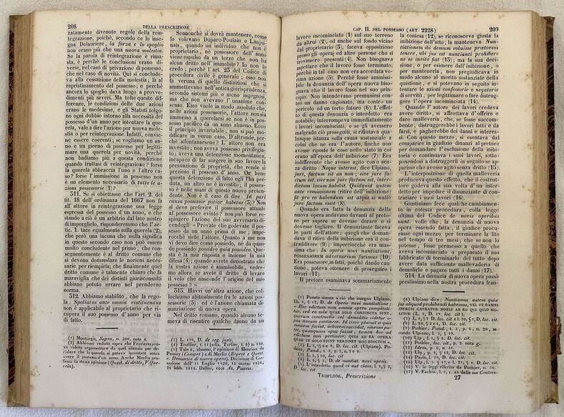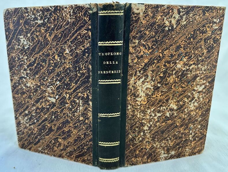 Edizione del 1842 di questa monografia sul diritto civile spiegato secondo l'ordine del codice della sprescrizione o commentario del titolo XX del libro III del codice civile a cura di Troplong. In buone condizioni e completo. Copertina in mezza pelle con titolo e decorazioni in oro al dorso in ottime condizioni generali con lievi usure ai margini e dorso. Legatura in buone condizioni. All'interno le pagine si presentano in buone condizioni con fioriture. In 8. Dim. 23,5x15,5 cm. Pp. 592.Edition of 1842 of this monography about civil right explained according to the order of code of prescription or commentary to the title XX of book III of civil code by Troplong. In good conditions and complete. Copertina in mezza pelle con titolo e decorazioni in oro al dorso in ottime condizioni generali con lievi usure ai margini e dorso. Legatura in buone condizioni. All'interno le pagine si presentano in buone condizioni con fioriture. In 8. Dim. 23,5x15,5 cm. Pp. 592. In very good conditions and complete. Half leather coeval cover with gilted title and decorations in very good general conditions lightly worn in the extremities. Binding in good conditions. Inside pages are in good conditions with occasional foxing. In 4. Dim. 29,5x20 cm. Pp. CXXXI+(1)+352.<BR><BR>