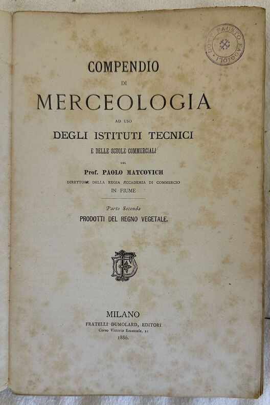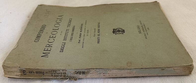 Edizione del 1886 di questo compendio di merceologia di Paolo Matcovich ad uso degli istituti tecnici e scuole commerciali. Siamo in possesso del secondo tomo sui prodotti del regno vegetale. Nella prima parte sostanze alimentari: cereali e derivati, legumi o civaje, materie zuccherine, prodotti della fermentazioen alcolica (vino, birra); alimenti esilaranti o nervosi (caffè, tabacco); frutti e semi alimentari (agrumi, fichi, datteri, olive, uva passa, carrobbi, castagne, noci, pistacchi, pinoli), condimenti e dr oghe (senape, soia, tartufi, capperi, pepe, noci moscate, garofani, pimento, cannella, vaniglia, carvi, cumino, zafferano, coriandolo). Seguono vegetali o parti di vegetali di applicazione medicinale, secrezionie succhi vegetali di applicazione medicinale ed industriale, olie grassi vegetali, tabelle con composizioni e reazioni degli olii, materie colorantimaterie concianti, fiori e frutti, fibre tessili per lavori di intreccio ecc... In discrete condizioni. Copertina editoriale in discrete condizioni generali con lievi usure ai margini e dorso mancante. Legatura quasi assente. All'interno le pagine si presentano in buone condizioni con fioriture. In 8. Dim. 23x15 cm. Pp. t280.Edition of 1886 of this resuming of trade of goods by Paolo Matcovich for the usage of commercial schools. We only have the second tome about the products of vegetal reign. Different parts are dedicated to food In fair conditions. Editorial cover in fair general conditions lightly worn in the extremities with spine missing. Binding is almost missing. Inside pages are in good conditions with foxing. In 8. Dim. 23x15 cm. Pp. 280.