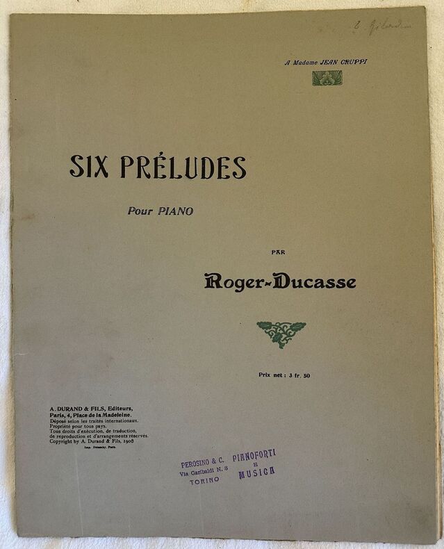 Edizione del 1908 della melodia "Six preludes pour piano" del compositore francese Jean Jules Aimable Roger-Ducasse (1873-1954). In buone condizioni. Copertina editoriale in buone condizioni con lievi usure marginali. Piatto anteriore in parte staccato. Legatura editorialmente assente. Pagine in buone condizioni con fioriture. In folio. cm. 32,5x25,5. Pp. 15Edition of 1908 of the melodiy "Six preludes pour piano" by the french composer Jean Jules Aimable Roger-Ducasse (1873-1954). In good conditions. Editorial cover in good conditions lightly worn in the extremities. Front plate is partially detached. Binding is editoriarly missing. Pages in good conditions with foxing.In folio. cm. 32,5x25,5. Pp. 15.<BR><BR>