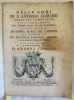 Finisisma edizione del 1752 di questa orazione su Sant'Andrea Corsini a cura del sacerdote fiorentino Niccolò Antonio Pillori. Orazione detta nella Chiesa di Santa Maria del Carmine di Firenze. Il volume è illustrato da tre finissime calcografie di Francesco Allegrini (n. 1729) su disegno di Giuseppe Zocchi (1711-1767): stemma al frontespizio, Palazzo Corsini in Firenze, una scena di guerra e due lettere iniziali decorate.<BR><BR>Frontespizio stampato in rosso e nero. In buone condizioni. Copertina morbida coeva in discrete condizioni con lievi usure marginali. Legatura in buone condizioni. Pagine in buone condizioni con fioriture. In 8. cm 26,5x20. Pp. 28.Very fine edition of 1752 of this oration about Sant'Andrea Corsini by the priets from Florence Niccolò Antonio Pillori. Oration told in the Church of Santa Maria del Carmine in Florence. The volume is illustrated by three very fine calcographies by Francesco Allegrini (n. 1729) after Giuseppe Zocchi (1711-1767): mark in the title page, Palazzo Corsini in Florence, a scene of war and two decorated capital letters. Red and black title page. In good conditions. Soft coeval cover in fair conditions lightly worn in the extremities. Binding in good conditions. Pages in good conditions with foxing. In 8. cm 26,5x20. Pp. 28.