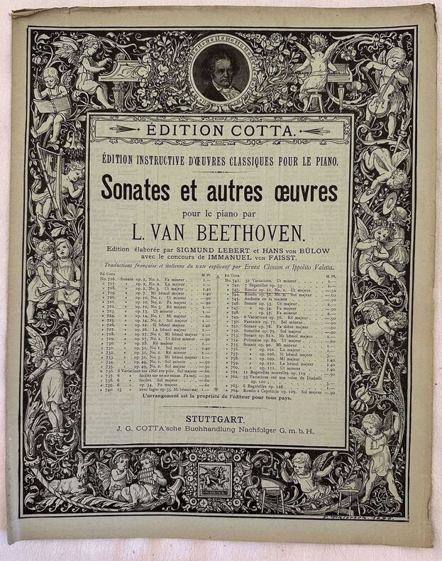 Edizione del 1901 della melodia per pianoforte "Rondo op. 51 n. 1 in Do Maggiore" di Ludwig Van Beethoven riviste da Immanuel von Faisst e Sigmund Lebert. Traduzione italiana a cura di Ippolito Valetta. In discrete condizioni. Copertina editoriale in buone condizioni generali con lievi usure ai margini e dorso. Legatura editorialmente mancante. Pagine in buone condizioni con fioriture. In folio. cm. 34,5x27,5. Pp. 7.Edition of 1901 of the melody for piano "Rondo op. 51 n. 1 in Do Maggiore" by Ludwig Van Beethoven reviewed by Immanuel von Faisst and Sigmund Lebert. Italian translation by Ippolito Valetta. In fair conditions. Editorial cover in good conditions lightly worn in the extremities. Binding is editorialrly missing. Pages in good conditions with foxing. In folio. cm. 34,5x27,5. Pp. 7.