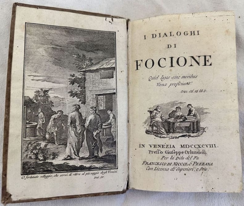 Edizione veneziana del 1798 del libello antilluministico del pensatore politico francese Etienne Bonnot de Mably (1709-1785) fratello del Condillac. Bonnot mette in bocca a Focione le sue idee sociali e politiche che vogliono una societa intrisa di principi repubblicani e monarchici senza gli eccessi estremistici.Graziosa incisione in antiporta e vignetta al frontespizio. L'antiporta è stata stampata utilizzando la stessa matrice dell'edizione del 1764 stampata da Giambatista Pasquali per Niccolò Pezzana. In buone condizioni e completo. Copertina in mezza pelle coeva in buone condizioni generali con lievi usure ai margini e dorso. Legatura in buone condizioni. All'interno le pagine si presentano in buone condizioni con fioriture. Piccolo segno di tarlo fino a pag. 4 e da pag. 225 alla fine senza perdita di testo. In 16. cm 16,5x10,5. Pp. (4)+231+(1).<BR>Venetian edition of 1798 of antilluministic book by the french phylosopher Etienne Bonnot de Mably (1709-1785) brother of Condillac. Bonnot under the pseudonymous of Focione expresses his social and political ideas of a republican and monarchic society with no excesses. Nice plate in the frontspice and vignette in the title page. The frontspice has been published using the same plate as the edition of 1764 published by Giambatista Pasquali on behalf of Niccolò Pezzana. In good conditions and complete. Half leather coeval cover in good general conditions with wearings. Binding in good conditions lightly disbound. Inside pages are in good conditions with foxings. Light worming until pag. 4 and from pag. 225 to the end with no loss of text. In 16. cm 16,5x10,5. Pp. (4)+231+(1).<BR>