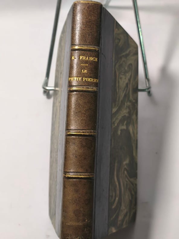 Anatole France est déjà âgé de 74 ans quand il livre avec précisions et un ton de confidence dans Le Petit Pierre (1918) ce qu'il a déjà auparavant évoqué dans Le Livre de mon ami (1885), puis dans Pierre Nozière (1899). Au contraire des deux premiers Le Petit Pierre se présente beaucoup plus riche en notations qui révèlent le caractère de l'auteur. « France nous y apprend que son esprit s'est modelé sur celui de son père, traditionaliste, spiritualiste et même chrétien, mais 'comme une coupe moulée sur le sein d'une amante' ! C'est-à-dire qu'il en reproduisit en creux les plus suaves rondeurs. Façon bizarrement poétique poétique d'exprimer qu'il prit en toutes choses contre-pied des opinions [...] de son éducateur ! ». Jolie provenance pour cet ensemble de souvenirs conservé dans une chemise-étui au nom de Paul Souday. Critique littéraire, ami de l'auteur, Souday est entre autre célèbre suite à la polémique qui l'opposa à Marcel Proust auquel il reprocha dans une tribune du Temps (10 décembre 1913) les «fautes de français» dans Du côté de chez Swann... L'histoire dit que l'auteur de la Recherche lui pardonna, qu'ils devinrent même amis et que ce qui les avaient fâchés devint un sujet de plaisanterie. Des bibliothèques Paul Souday puis Lucien Graux (ex-libris).