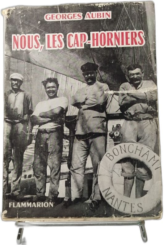 Paris Flammarion 1957 -in-8 broché un volume, broché in-octavo sous jaquette illustrée d'une photographie de groupe à bord du Bonchamp en noir (titrée en rouge et blanc) (paperback with front jacket illustrated in-black) (21,5 x 15,5 cm), dos de la jacquette blanc imprimé en rouge et noir, toutes tranches non rognées (edges no smooth), Ex-Libris gravé en noir en haut de la page de garde : Ex-Libris : Armand Eve (Directeur du Musée de la Poste de Nantes), envoi autographe manuscrit de l'Auteur à l'encre bleue en haut de la page de faux-titre : "...a Monsieur Armand EVE avec toute la sympathie d'un de "NOUS LES CAP-HORNIERS" et avec le souvenir amical de l'auteur ...(signé) AUBIN....", illustré de 8 pages hors-texte (soit 14 photographies en vert) + 4 Cartes in-texte en noir, (225 + 1 p. de Tables) pages, 1957 à Paris Flammarion Editeur,