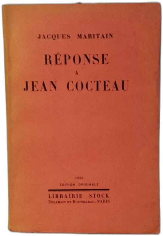 Deux volumes peu épais in-12°, brochés, couverture souple éditeur de couleur rose saumon.LETTRE A JACQUES MARITAIN : 70 pages; REPONSE A JEAN COCTEAU: 70 pages.Entre Jacques Maritain (1882-1973) et Jean Cocteau (1889-1963) l'amitié a duré de 1923 jusqu'à la mort du poète. Deux textes passionnants. Où il est question d’art, bien sûr, et d’opium, de Radiguet, de musique (Satie, Milhaud, Stravinsky), de spiritualité, de poésie (Max Jacob, Reverdy ) de foi religieuse (thomisme ), du mal et du bien et de philosophie... Beaux- ex-libris, dos décolorés par la lumière, BON ETAT seulement.