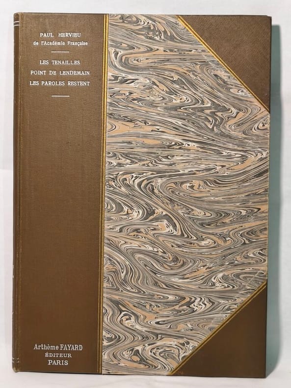 Reliure demie-percaline brune à coins. Dos lisse avec étiquette ainsi que filets doubles, titres, fleuron et mention d'auteur en blanc. Filets doubles dorés le long du cartonnage sur les plats. Premier plat avec titres, mentions d'auteur et d'éditeur en blanc. Frottements sur le dos et la quatrième de couverture. . Document papier accolé à la garde blanche. Couverture en couleurs conservée en bon état. Frontispice en noir et blanc figurant une portrait photographique de l'auteur. Ex-libris tamponné et écriture manuscrite sur la page de titre. Bel état de contenu orné d'illustrations d'après les dessins en noir et blanc de Maurice LALAU, in- et hors-texte.
