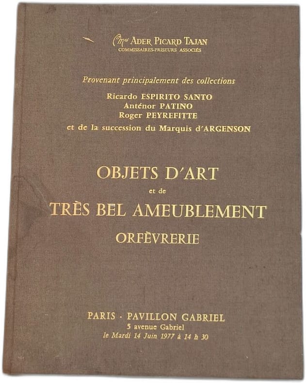 Ventes aux enchères, juin 1977, Pavillon Gabriel, Paris. Collection Ricardo Espirito Santo, Anténor Patiño, de la succession du Marquis d'Argenson et divers. Classification Dewey : 745.1-Antiquités