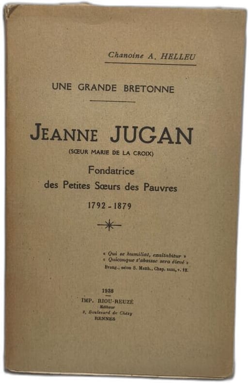 1938 broché (paperback) petit in-octavo, dos muet marron (brown spine - no title), première de couverture imprimée (front cover printed), tranches non rognées (edges no smooth), illustration : 1 frontispice portrait de Jugan (illustration : Jugan's portrait in frontispiece), 203 pages, 1938 à Rennes H. Riou-Reuzé Imprimeur-Editeur,