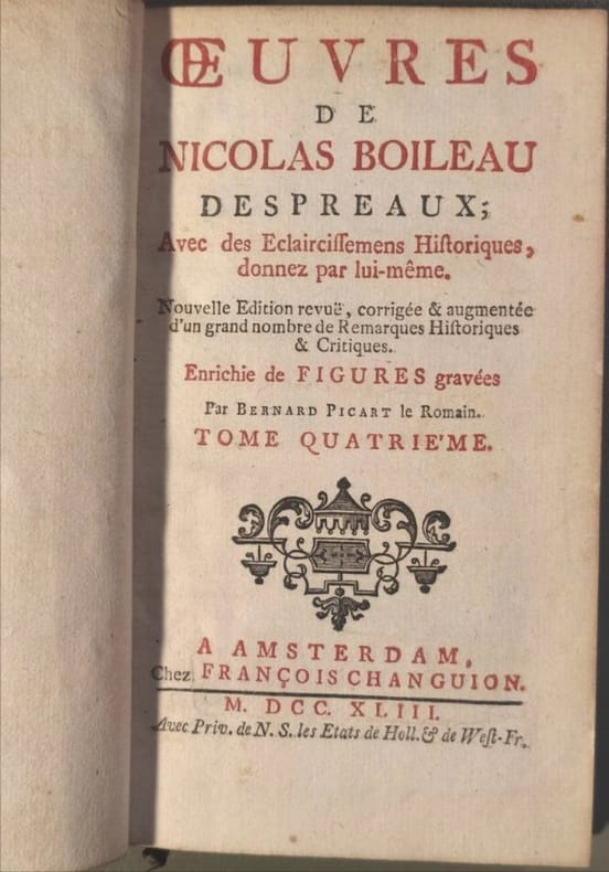 Conrad Walther 1767 in12. 1767. Relié. Oeuvres de Nicolas Boileau Despréaux avec des éclaircissements historiques donnés par lui même et la vie de l'auteur par Mr; Des Maizeaux - nouvelle édition ornée de figures et vignettes - tome quatrième contient: les héros de romans + arret burlesque + discours sur la satire + remerciement a messieurs de l'académie française + Lettres Vivonne Le verrier Arnauld Racine... + Préfaces diverses