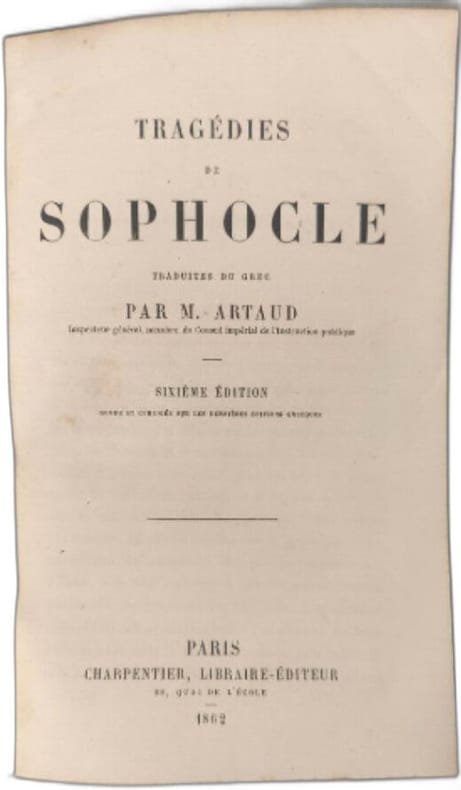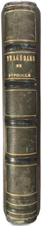 Paris 1730. 4 vols.in-4 en reliure d'époque. ( 3 vols + un supplément, Les Tragédies de Sophocle daté de 1773). Tome I: Frontispice de Cazes, clxix, 403 p., ciij. Tome II: 737 p. Tome III: 425 p., carte dépliante de la Grèce et planche gravée de monnaies, Table Générale des Matières. Tome IV: 374 p. avec Notes sur l'Antigone.Edition rare avec le supplément. Reliures en veau glacé avec dos ornés. Etat très moyen. Rousseurs et mouillures.Coins émoussés.Mors et charnières très fragiles.Tranches rouges.