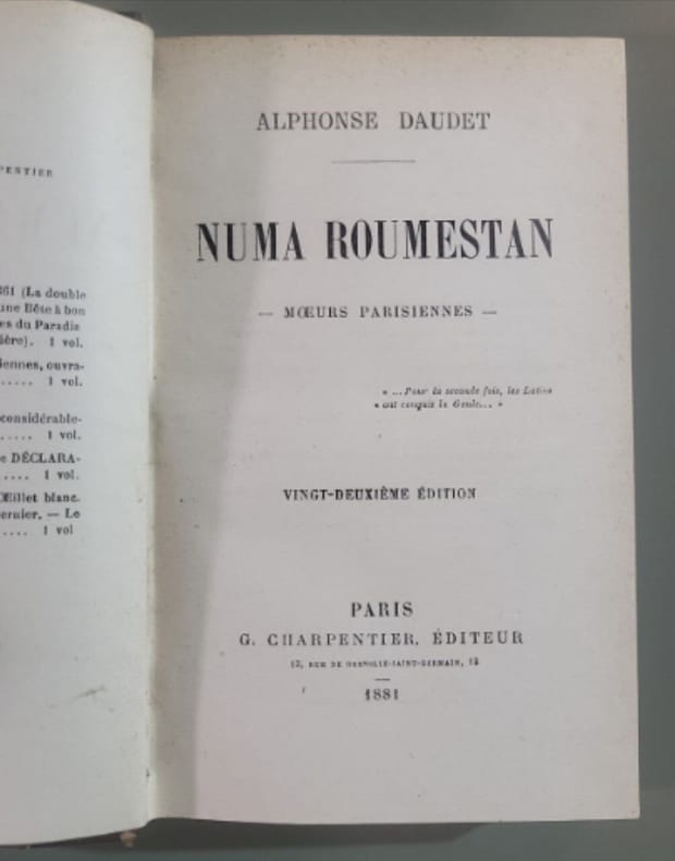 Numa Roumestan est un roman antiméridionaliste d’Alphonse Daudet publié en 1881, mettant en scène un personnage du nom de Numa Roumestan. Il a été porté en pièce de théâtre en 1887 à l’Odéon de Paris. Aux arènes d'Aps-en-Provence, la foule applaudit Numa Roumestan. À quarante-trois ans, devenu un homme politique en vue, il est de retour au pays avec sa femme Rosalie, déconcertée puis charmée par la couleur locale. Numa, vingt ans plus tôt, faisait son droit à Paris, financé par un cabaretier qui spéculait sur ses talents prometteurs... vol relié in12, 150x100, très bel état intérieur, 406pp. Tranche de tête dorée à l'or fin. Paris, Alphonse Lemerre, 1886 ref/152