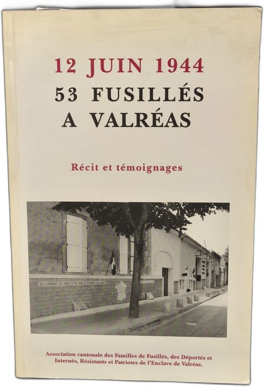 Association cantonale des Familles de Fusillés, des Déportés et Internés, Résistants et Patriotes de l'Enclave de Valréas, 1994, grand in-8 br., 145 p., 3ème édition augmentée, préambule de Jean Duffard, avant-propos de Jean Garcin, introduction tirée de l'ouvrage de Jean Pagnol, carte, ex-dono, couverture à rabats, très bon état.