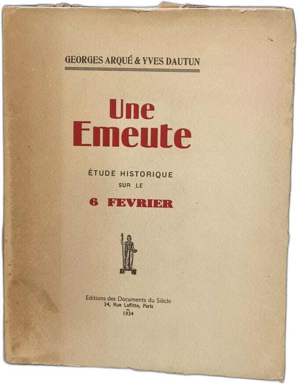 Paris, Éditions des Documents du Siècle, Paris, Éditions des Documents du Siècle1934 ; in-4, broché. 260 pp., 6 ff. n. ch.ÉDITION ORIGINALE. Étude, par deux journalistes, des émeutes antiparlementaires devant la chambre des Députés le 6 février 1934. Des associations d’anciens combattants et les ligues d’extrême droite, Action française, Jeunesses patriotes, Camelots du roi, Solidarité française et autres Croix-de-feu ont manifesté pour protester contre le limogeage du préfet Chiappe à la suite de l’affaire Stavisky. Place de la Concorde l’émeute fit une trentaine de morts et plus de 2000 blessés. Cette crise provoqua la chute du second gouvernement Daladier. Un des 70 exemplaires numérotés sur pur fil Lafuma (n° 69) avec un ENVOI AUTOGRAPHE de Yves Dautun (1903 - 1973) à un ami non nommé : “Avec tout mon cœur et en gage de mon amitié fraternelle, accepte, cher grand ami, ce récit sans fard et sans colère, d’une Émeute dont nous avons, toi et moi, savouré en connaisseurs l’émotion âpre et subtile, Paris 1934.” Y. Dautun, né en 1903, sera rédacteur au Petit parisien. Il collaborera à La Gerbe à L’Émancipation nationale, au Cri du peuple, puis au Figaro littéraire de 1958 à 1968.