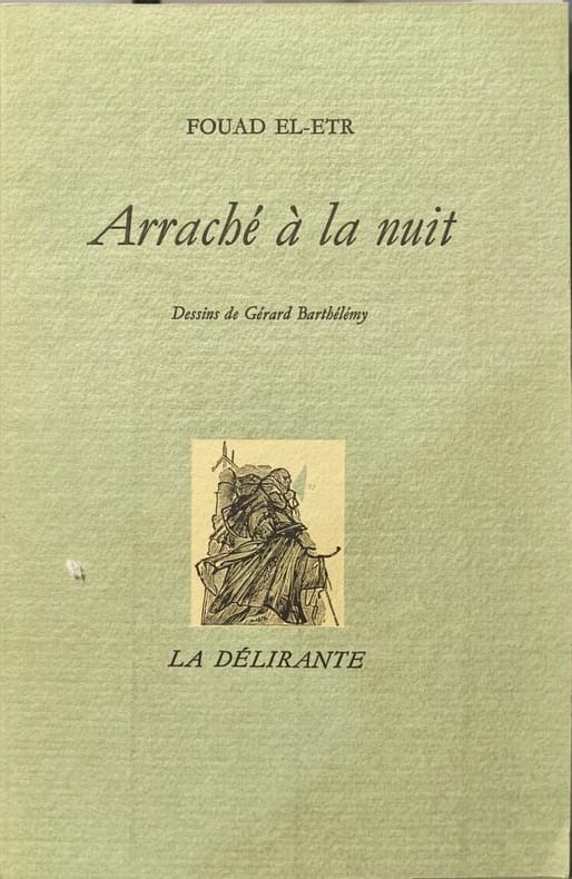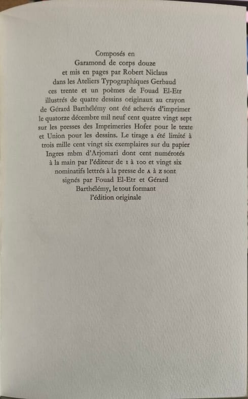 Paris La Délirante 1987 in 8 (24x15,5) 1 volume broché, couverture imprimée, plat supérieur titré et illustré d'une vignette, 47 pages [4], avec 4 Illustrations originales de Gérard Barthélémy, dont 3 hors-texte. Imprimé sur papier Ingres mbm d'Arjomari. 31 poèmes de Fouad El-Etr. Très bel exemplaire