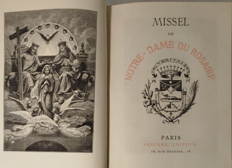 Sanchez. 1887. In-16. Relié plein cuir. Bon état, Coins frottés, Dos satisfaisant, Papier jauni. 507 pages. Titre, filets et fleurons en doré au dos+ 5 nerfs. Tranches dorées. Signet conservé. Frontispice illustré en noir et blanc. Pages illustrées en noir et blanc, dont certaines gravures sous serpente. Texte en latin et français.. . . . Classification Dewey : 260-Théologie sociale chrétienne