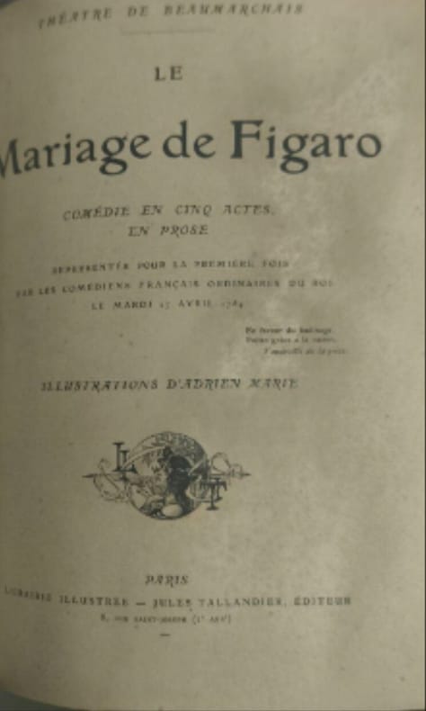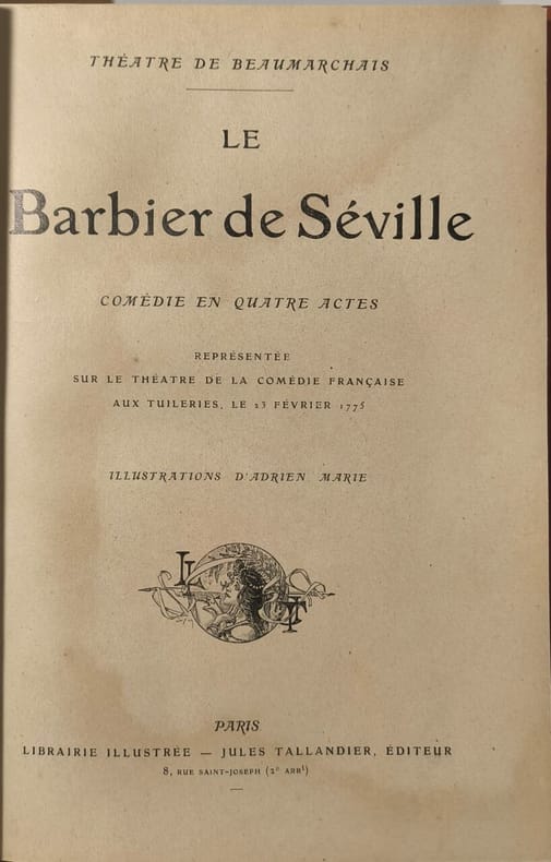 Jules tallandier 158 pages in8. Sans date. reliure éditeur demi basane dos à nerfs. 158 pages. Il s'agit de l'édition par Jules Tallandier début 1900 de deux pièces majeures de Beaumarchais 'Le Barbier de Séville' (1775) et 'Le Mariage de Figaro' (1784) formant les deux premières parties de sa trilogie centrée sur le valet Figaro. La première est une comédie d'intrigue où le Comte Almaviva aidé de Figaro séduit Rosine tandis que la seconde plus audacieuse et politique critique l'aristocratie à la veille de la Révolution