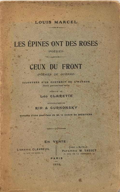Librairie Clavreuil / Papeterie M. Vasset 1920 276 pages in8. 1920. broché. 276 pages. Recueil de poésies publié en 1920 contenant deux parties distinctes : 'Les épines ont des roses' (poésies d'avant-guerre au ton plus léger) et 'Ceux du front' (poèmes directement inspirés par la Première Guerre mondiale). L'ouvrage est préfacé par Léo Claretie et comprend un portrait de l'auteur