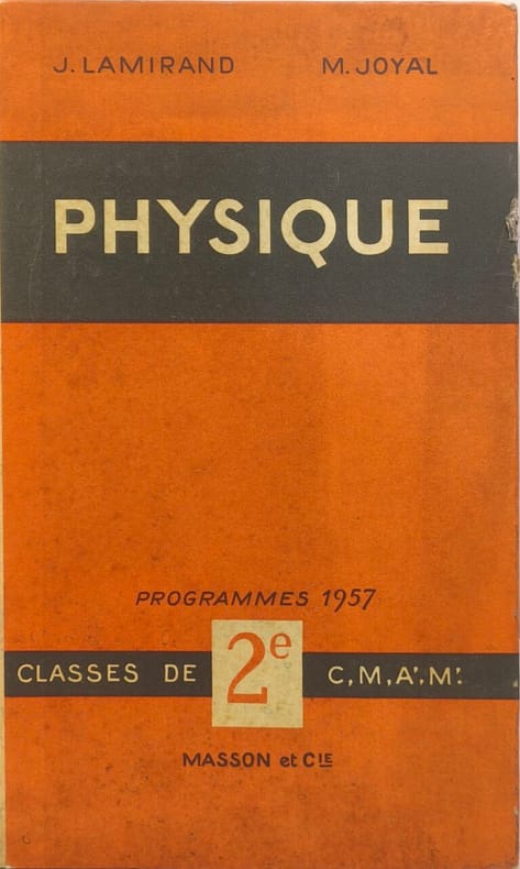 Masson et Cie 1961 296 pages in8. 1961. Reliure editeur cartonnée. 296 pages. Manuel de physique destiné aux classes de seconde (séries A et B) du système éducatif français publié par Masson et Cie entre les années 1940 et 1960. Co-écrit par J. Lamirand et M. Joyal il suit les programmes officiels (comme celui de 1945) et propose un enseignement structuré avec figures lectures exercices et problèmes