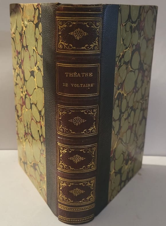 A Paris, Chez Antoine-Augustin Renouard, 1809, 9 volumes in-8 de 210 x 130 mm, de 380 à 551 pages chacun, chaque colume comporte 1 faux-titre, 1 titre avec vignette, 1 ou 2 feuillets de notes à la suite de chaque pièce et une table des pièces in-fine. Reliures en pleine basane racinée, dos lisses ornés portant titre et tomaison dorés sur pièce de cuir rouge, roulette d'encadrement sur les plats, roulette dorée sur les coupes, tranches marbrées. Complet des 44 planches dont le portrait de Voltaire par St Aubin. Au tome 8 les pages 261 à 269 sont reliées dans le désordre (sans manque), au tome 9 les feuilles 427 à 430 les feuillets ne sont pas alignés avec le volume (sans gêne à la lecture), bon état intérieur. Coiffes, coins et coupes émoussés sur certains volumes sinon très agréable exemplaire.