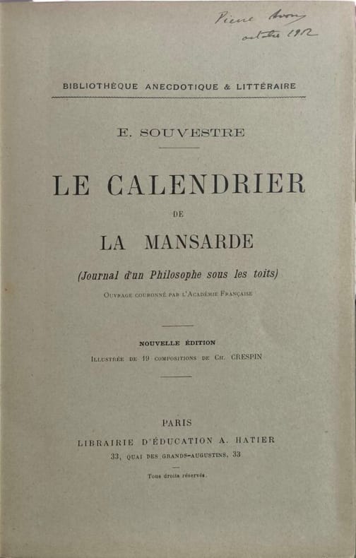Librairie A. Hatier 1875 239 pages in8. 1875. reliure editeur pleine toile. 239 pages. Ouvrage littéraire d'Émile Souvestre probablement un journal philosophique ou une œuvre à caractère introspectif évoquant la vie et les réflexions d'un individu retiré "sous les toits". Publié par la Librairie Hatier éditeur connu pour ses publications à destination scolaire et éducative