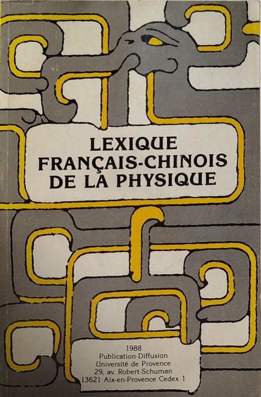 Publication-Diffusion Université de Provence 1988 422 pages in8. 1988. broché. 422 pages. Lexique bilingue français-chinois publié en 1988 par les Presses Universitaires de Provence contenant environ 6000 termes de physique. Chaque entrée française comprend la transcription phonétique la classe grammaticale et une ou plusieurs traductions en chinois