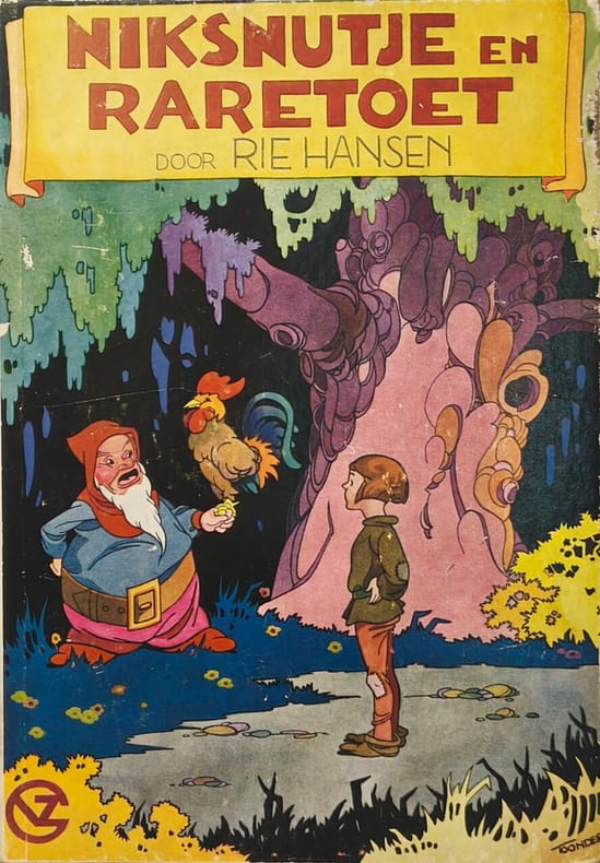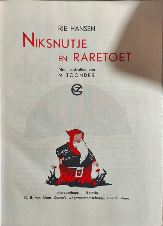 Gravenhage-batavia 1940 51 pages IN4. 1940. Reliure editeur cartonnée. 51 pages. Niksnutje en Raretoet est un conte pour enfants publié en 1941 écrit par Rie Hansen et illustré par le célèbre dessinateur néerlandais Marten Toonder. Il raconte l'histoire d'un garçon turbulent Niksnutje qui part à l'aventure après avoir rencontré le Gnome du Vent Raretoet. Au cours de son voyage vers la Cité Inconnue il se fait des amis rencontre la Princesse Sproetélia et découvre qu'il est destiné à devenir roi