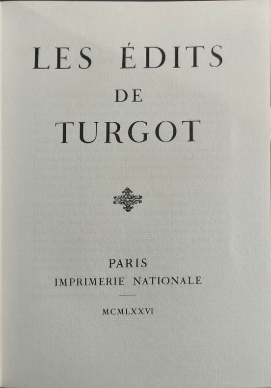 Imprimerie Nationale 1976 120 pages in8. 1976. reliure editeur plein basane dos à nerfs. 120 pages. Les édits de Turgot promulgués en 1776 sous le règne de Louis XVI constituent une série de réformes économiques majeures visant à libéraliser le commerce et le travail en France. Le plus célèbre d'entre eux supprime les corporations déclenchant de vives résistances. Ces édits s'inscrivent dans la pensée physiocratique et cherchent à moderniser l'économie du royaume