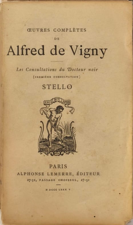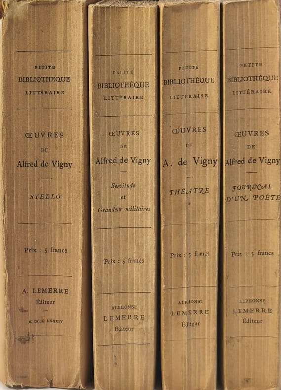 A. Lemerre 1885 485-319-307-298 pages in12. 1885. broché. 4 volume(s). 485-319-307-298 pages. Stello est un roman d'Alfred de Vigny publié en 1832 structuré en 42 chapitres. Il met en scène le Docteur Noir qui pour guérir le jeune poète Stello de ses aspirations idéalistes lui raconte l'histoire tragique de trois poètes (Gilbert Chatterton et André Chénier) persécutés par le pouvoir illustrant le conflit entre la création artistique et la société