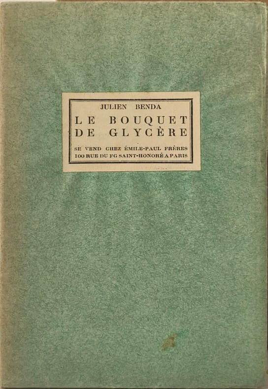 Émile-Paul Frères 1918 62 pages in12. 1918. Broché couverture rempliée. 62 pages. Le Bouquet de Glycère est un ouvrage philosophique de Julien Benda publié en 1918 composé de trois dialogues mettant en scène des personnages comme Philarète dans des débats d'idées de style socratique. L'œuvre explore des thèmes classiques de la pensée et du courage intellectuel caractéristique de l'écriture polémique et érudite de Benda